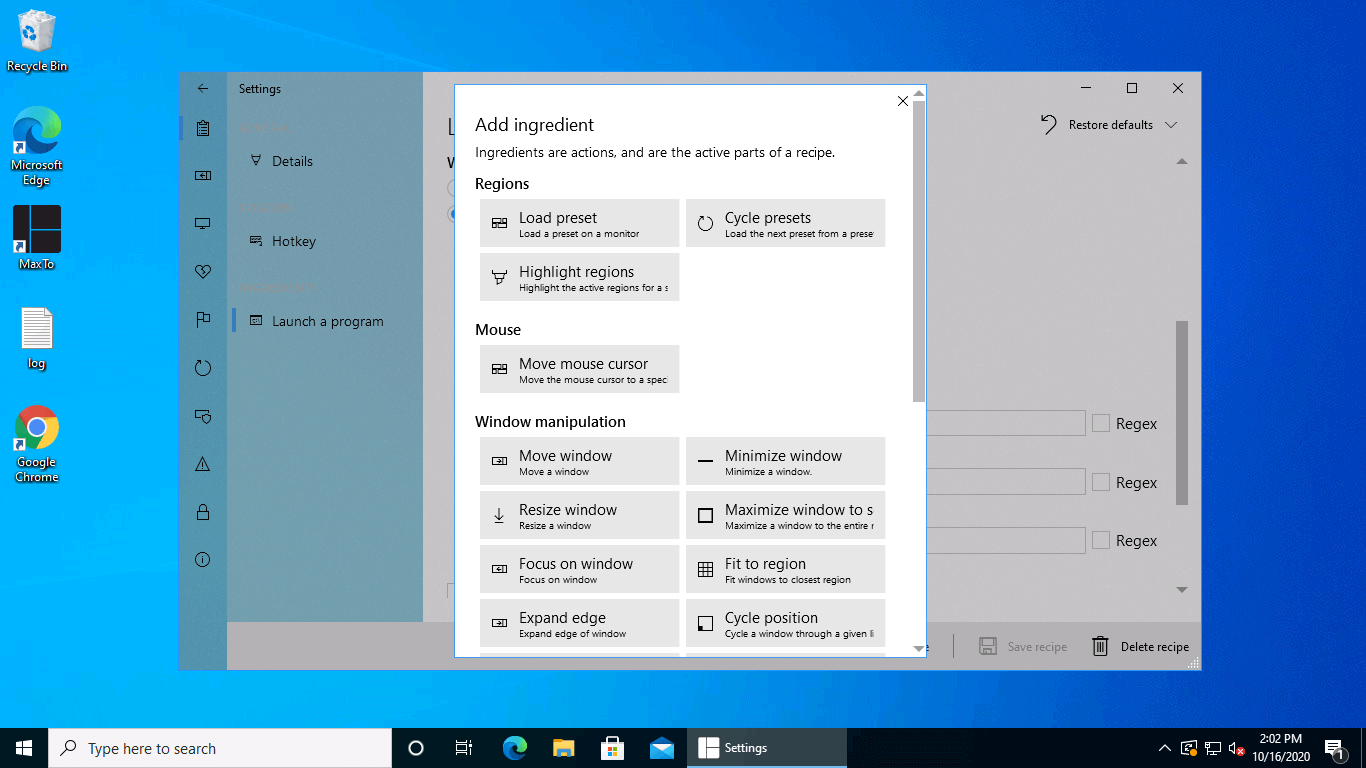 Click "Add ingredient"We now want to add the ingredient that will move the window to a specific region in a virtual desktop, so select the Move window command.