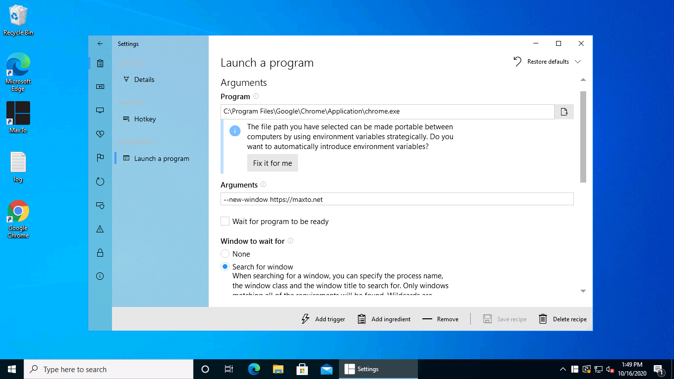 Test your recipe by hitting your hotkey (mine was Control X ). You will notice that Google Chrome launches, and after the website has loaded, MaxTo will move the window to the other virtual desktop.