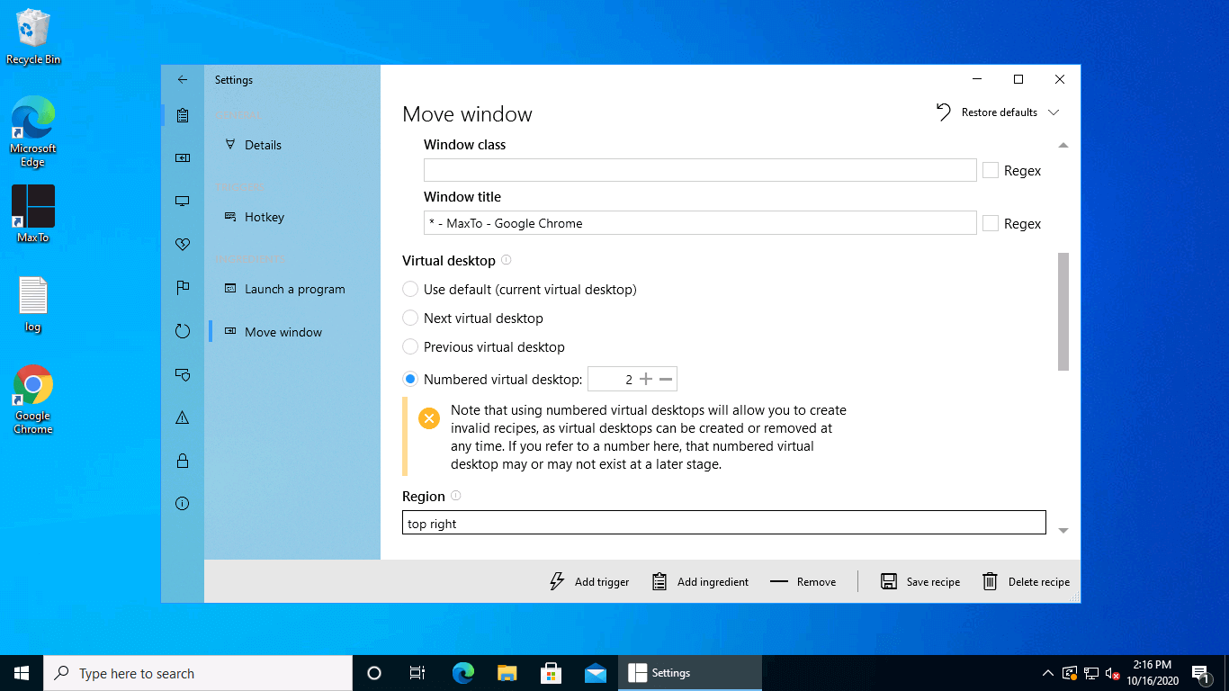 It's hereYou can use the same arguments for finding the window as you did earlier, and then set the numbered virtual desktop to 2, and the region to top right. Once you are done, hit Save changes, and the recipe will be available to run immediately.