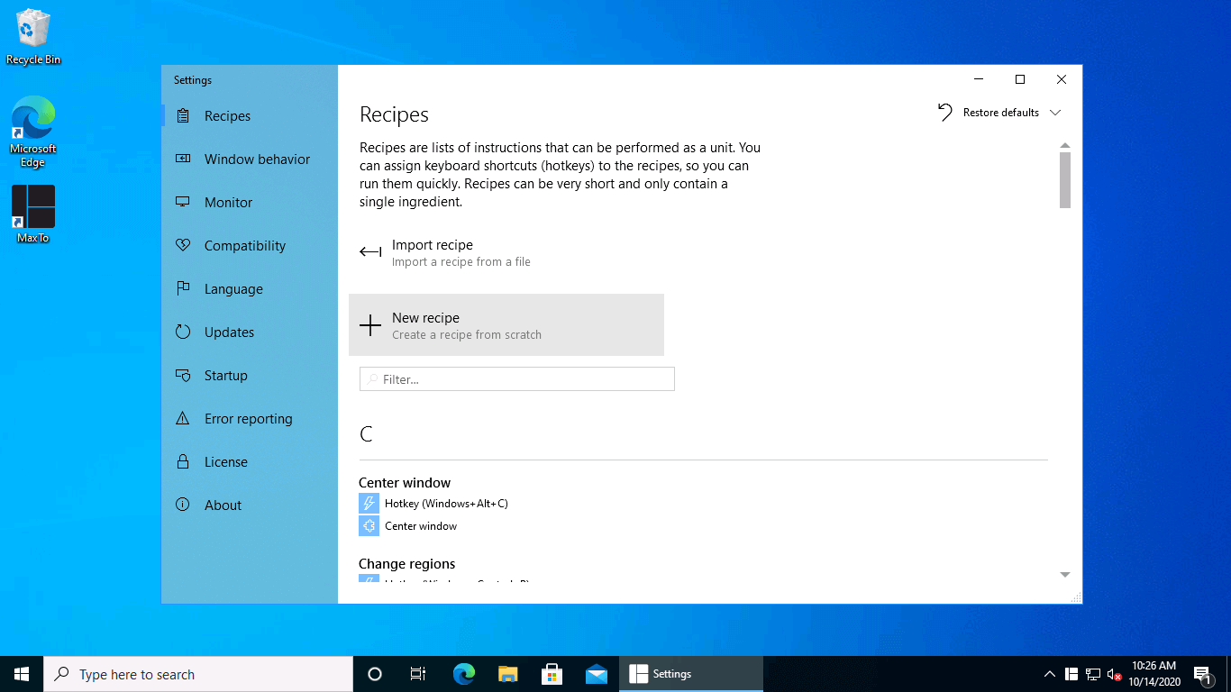 Get started by creating a new recipe in the Recipes view in Settings (hit Control T to open Settings).