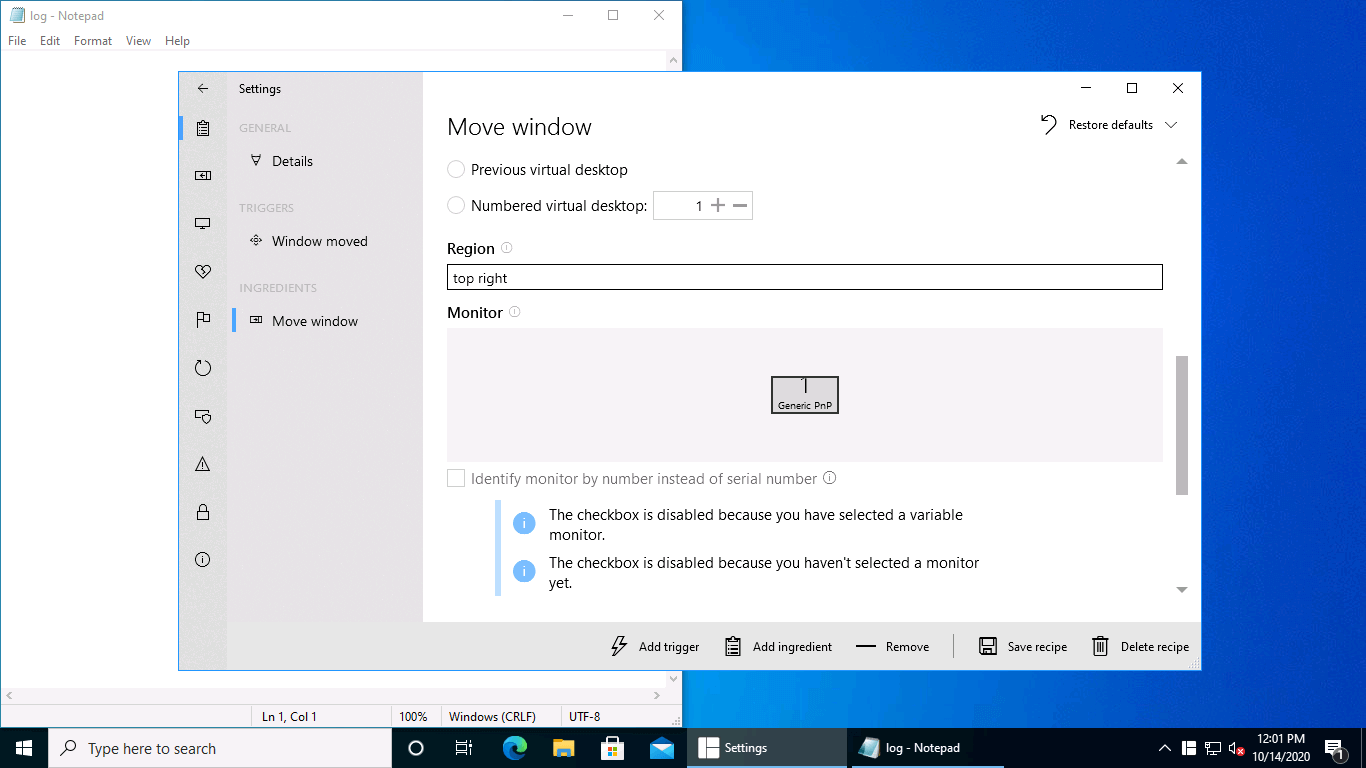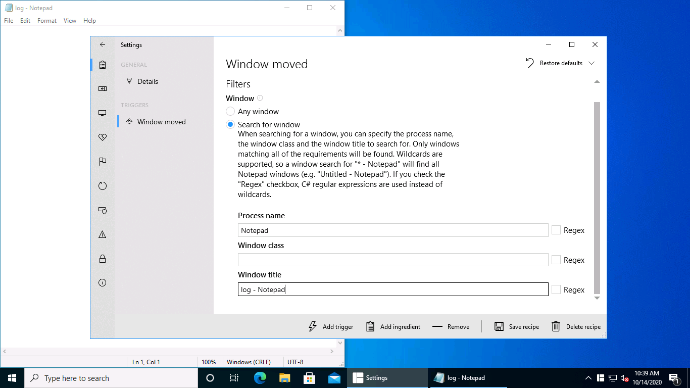 You can either leave the Window argument set to Foreground window, since Notepad will be the foreground window when the trigger happens, or you can use the same settings as above. For the Region property, you can type something like "top right" (or whatever corresponds to the region you want to use). Leave all the other arguments at their defaults. Then click Save recipe.